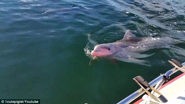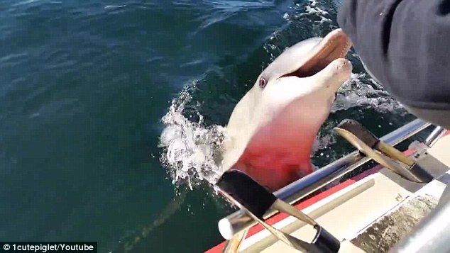 釣り人のボートに好奇心旺盛なイルカが近寄ってきました。