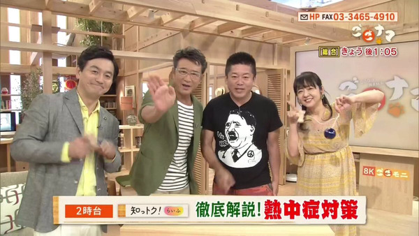 堀江氏はヒトラーを風刺したような柄の黒のTシャツを着て同番組の前半にゲスト出演。