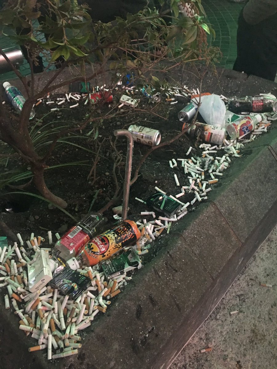 清掃員が 掃除してる横で火をもみ消し、