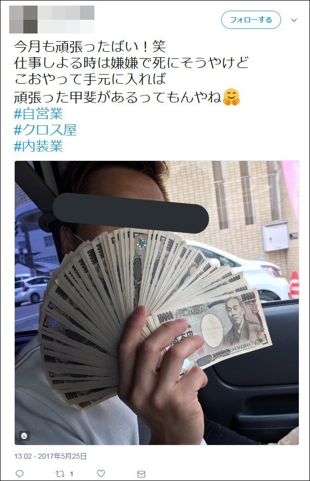 書いている。その他のツイートにも、男性が札束を手に持って撮影した画像などがある